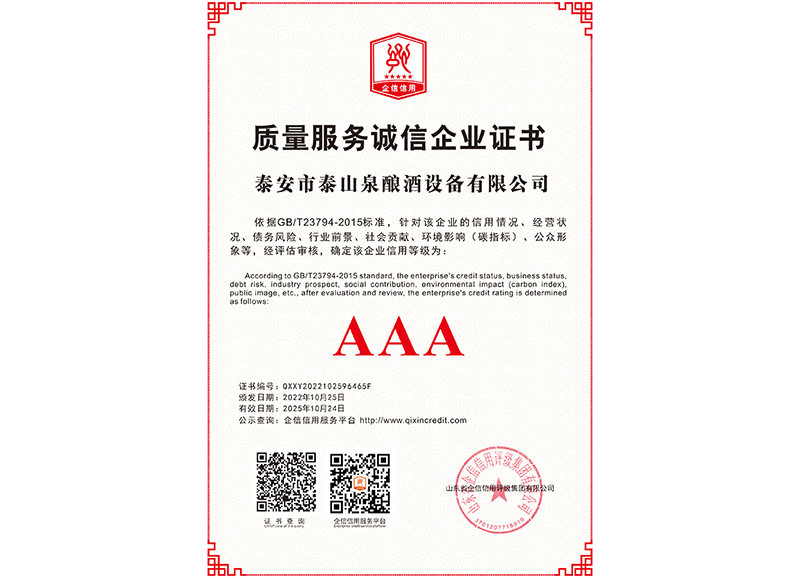 泰安市泰山泉釀酒設(shè)備有限公司,是一家專業(yè)從事釀酒設(shè)備機(jī)械化研發(fā)并集技術(shù)咨詢,工程設(shè)計(jì),制造安裝,人員培訓(xùn)及售后服務(wù)為一體的綜合性企業(yè),本公司主要產(chǎn)品為:大曲清香、小曲清香、大曲醬香、大曲濃香等香型白酒機(jī)械化設(shè)備。 本公司與中國科學(xué)院自動化研究所簽訂技術(shù)服務(wù)合同,引進(jìn)先進(jìn)技術(shù),研究生產(chǎn)全自動化機(jī)械釀酒設(shè)備,由中國科學(xué)自動化研究所的技術(shù)支持,打造最先進(jìn)的生產(chǎn)釀酒設(shè)備,公司有信心打造全國最先進(jìn)白酒...